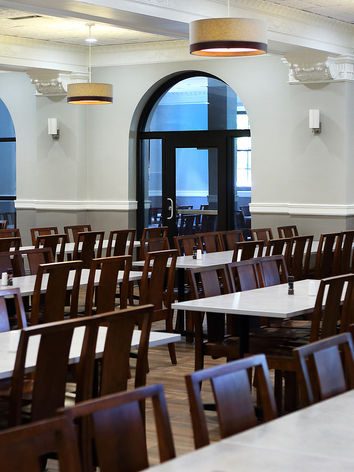The dining hall is located on the Baylor campus. This remodel involved the kitchen, serving, takeout, and dining areas, We brought in the color, introduced metal accents and created a fresh trendy look to the once dated dining area.